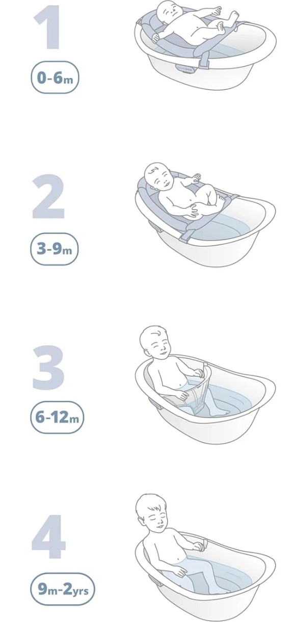 4‑în‑1: suport pentru nou-născut, modul pentru sugari în șezut, cadă spațioasă pentru copii activi și scaun confortabil pentru baie