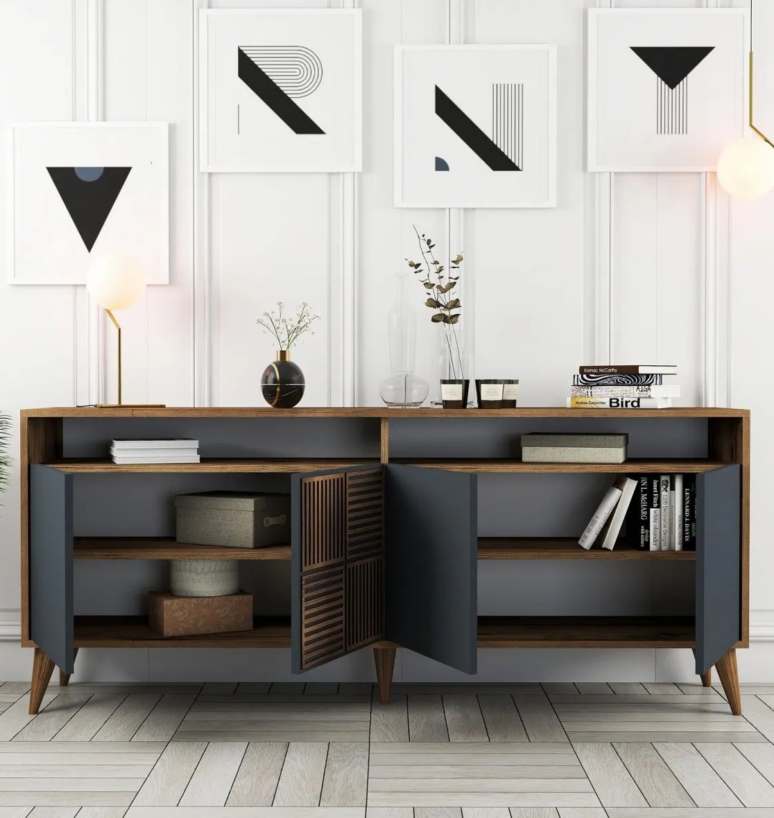Măsurând 180 cm lățime, 78. 6 cm în înălțime și 35 cm în adâncime, această consolă oferă un spațiu amplu de depozitare pentru bunurile dvs. Rafturile spațioase oferă o soluție convenabilă pentru organizarea lucrurilor esențiale, în timp ce picioarele din plastic, cu o înălțime de 17 cm, adaugă o notă de modernitate designului general.