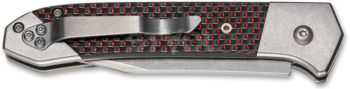 Mânerul este fabricat din fibră de carbon roșie, oferind un aspect elegant și o greutate redusă.