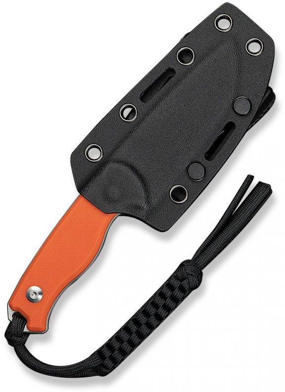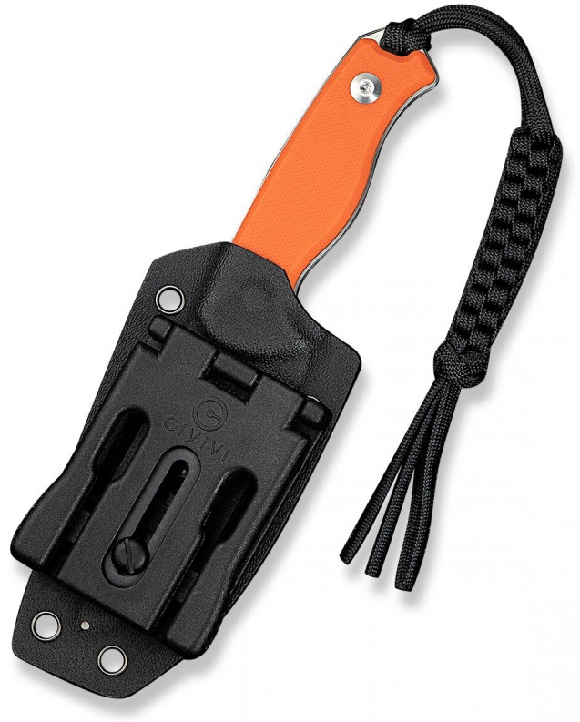 Produsul vine cu o teacă Kydex neagră, un șnur paracord și un T‑clip proiectat pentru transport convenabil la centură sau rucsac.