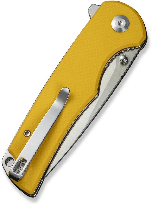 Mânerul texturat din material G10 de culoare galbenă oferă o priză fermă și confortabilă.