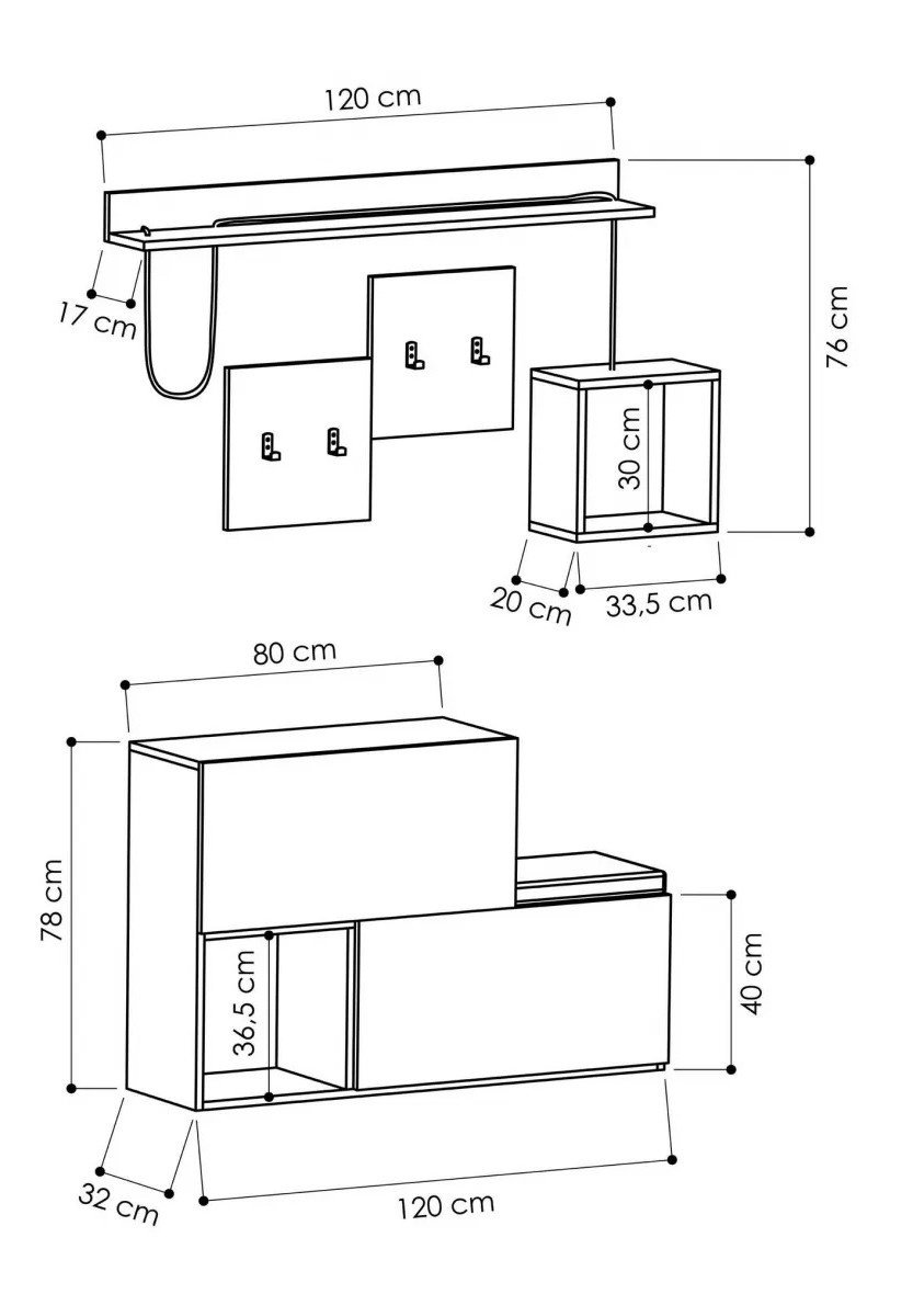 Dimensiuni cuier (LxÎxA)raft lung - 120x16 (LxA), raft pătrat - 32x32x19 (LxÎxA), panouri pătrate - 35.5x35.5 (LxÎ) cm