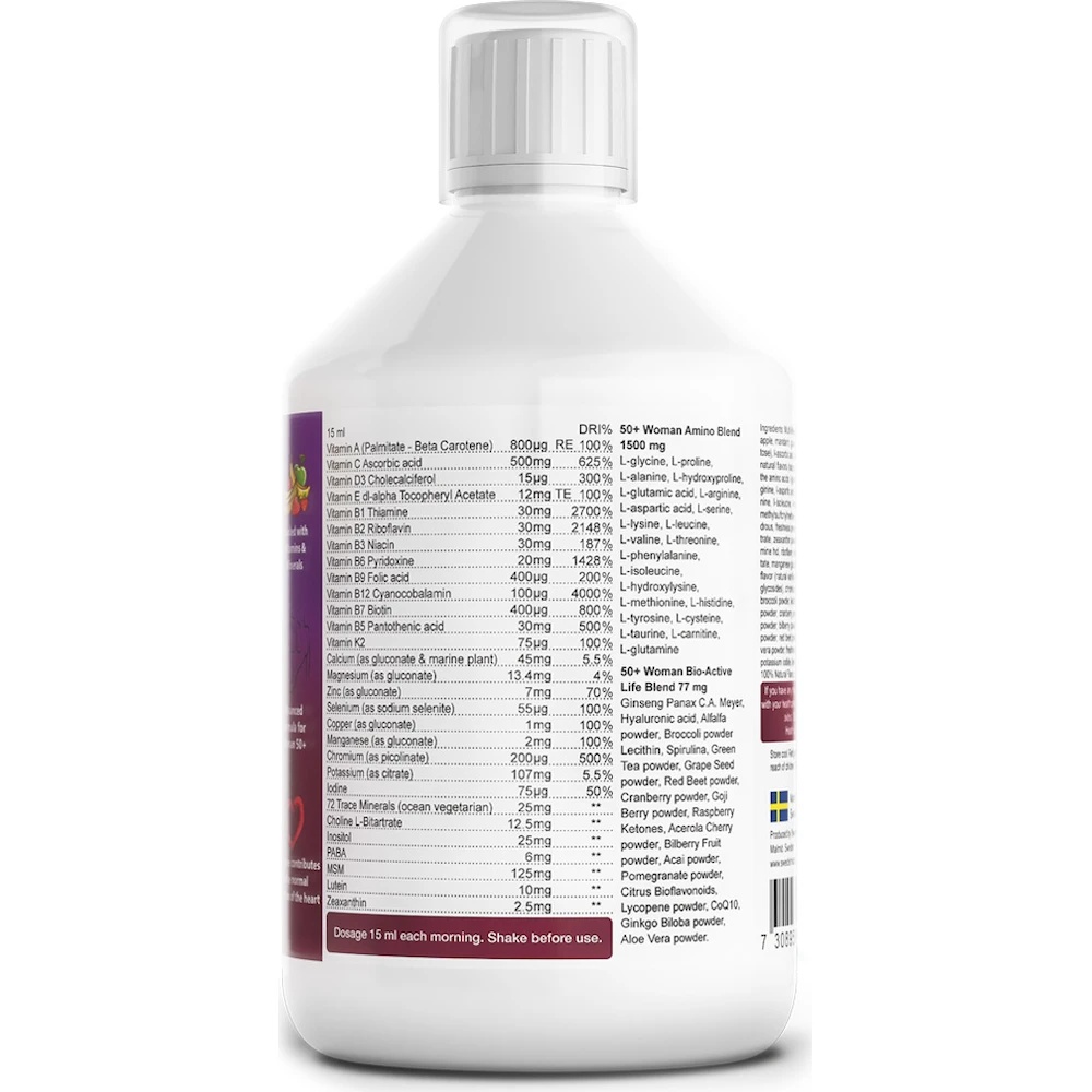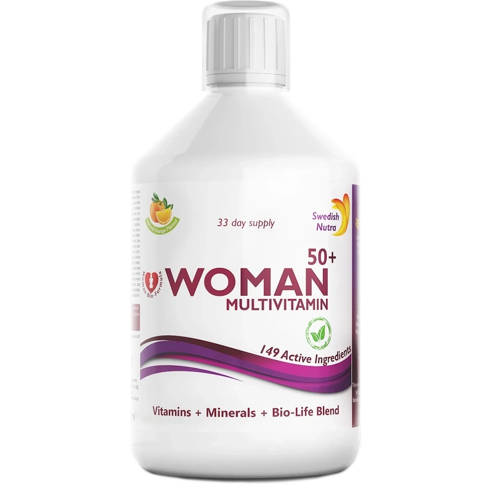 Swedish Nutra Woman Multivitamin 500ml este un complex de vitamine și minerale, special creat pentru a susține organismul feminin. Forma lichidă asigură o biodisponibilitate ridicată a nutrienților, permițând organismului să absoarbă eficient vitaminele și mineralele.