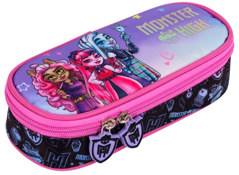 Suport oval pentru pixuri Monster High. Suport pentru pixuri glisant pentru fete. Suport pentru pixuri negru și violet pentru fete, cu design modern Monster High. Suportul poate depozita rechizite de birou fără nicio organizare, fiind ideal pentru fetele mai mari. Suportul oval pentru pixuri se închide cu un fermoar dublu. Interiorul este de culoare uni. Mânerul interior cu benzi elastice poate ține 10 articole de papetărie. Deasupra mânerului, în partea de jos a capacului, există buzunare. Sub mâner, există mai mult spațiu pentru a depozita alte unelte de diferite forme, fără a le fixa.