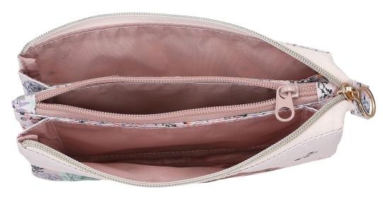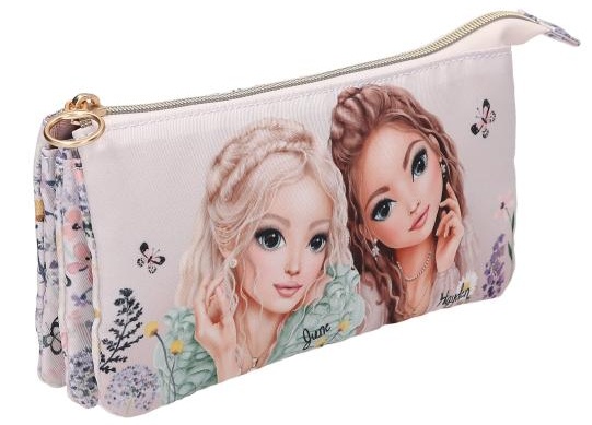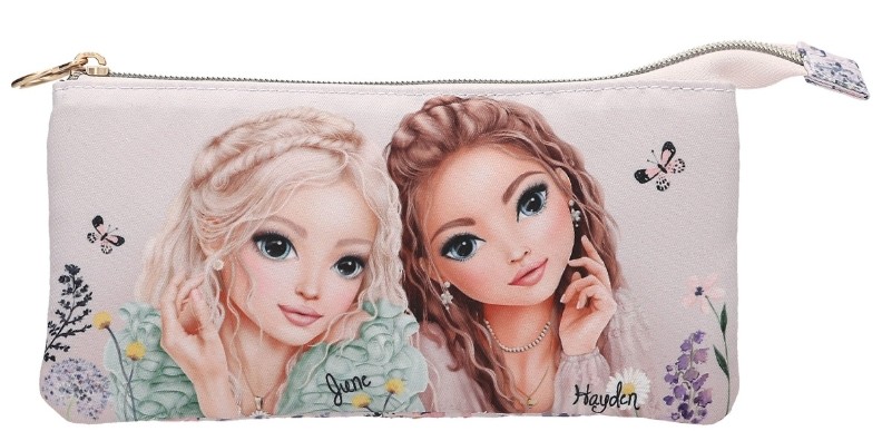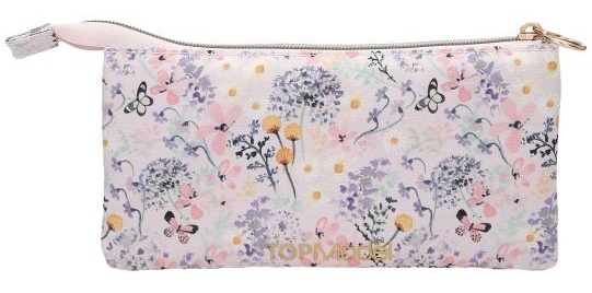 Geanta tip stilou TOPModel are un motiv romantic dublu cu flori delicate și fluturi pe față, care poate fi găsit și sub forma unui imprimeu drăguț pe spate. Trei compartimente sub fermoarul principal oferă spațiu pentru pixuri și alte obiecte, unul dintre ele având un fermoar suplimentar. Material: 100% poliester