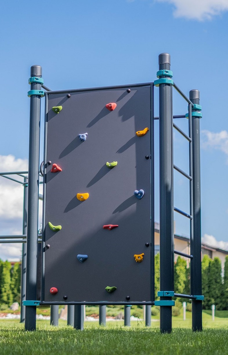 Materiale: țevile metalice (diametrul - 89 mm, grosime a peretelui - 3 mm) acoperite cu vopsea pulbere. Diametrul barelor este de 34 mm. Peretele de alpinism este realizat din placaj laminat rezistent la umiditate. Elementele complexului sportiv sunt conectate cu cleme metalice pe șuruburi și sunt reglabile în înălțime.