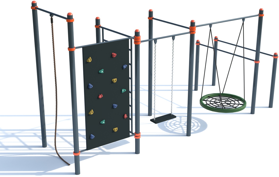 Setul include: 3 bare orizontale cu mai multe niveluri, scară suedeză, bare, frânghie, două leagăne, perete de cățărat.