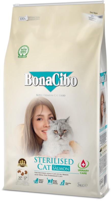 Bonacibo Adult Cat Light, Sterilised Urinary Salmon – formulat pentru pisici sterilizate sau predispuse la creșterea în greutate. Hrana conține niveluri atent echilibrate de proteine și grăsimi, care ajută la controlul greutății, oferind în același timp toate substanțele nutritive necesare într-o dietă gustoasă și completă.