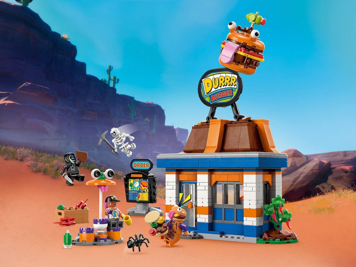 Jucătorii se vor bucura de construirea modelului restaurantului Durrr Burger, care este modular pentru a încuraja personalizarea, înainte de a descoperi toate detaliile încântător de distractive. În interior, copiii vor găsi o stație de condimente, un automat de sucuri și o casă de marcat, în timp ce afară, vor găsi o zonă de relaxare cu o cană și un ou prăjit. Există, de asemenea, o mansardă detașabilă care include o figurină păianjen și mult spațiu pentru alte accesorii, inclusiv o lopată și dinamită. Minifigurinele Beach Bomber, Beef Boss, Grimey și schelet aduc acțiunea la viață și încurajează jocul de rol imaginativ.