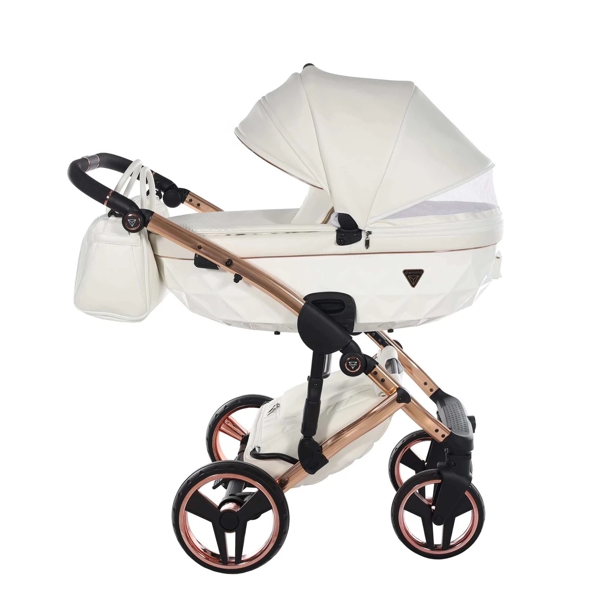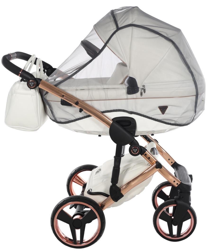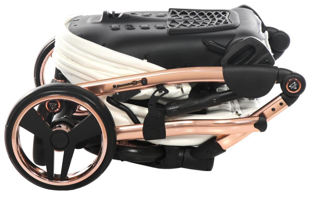 Căruciorul FLUO LINE combină tehnologia modernă cu designul elegant într-un mod uimitor. Ladoul este fabricat din plastic lustruit în formă de diamant, care nu numai că arată frumos, dar protejează și bebelușul de orice vânt, în timp ce capota și husa din piele ecologică sunt finisate în auriu sau argintiu, pentru a se potrivi cu cadrul căruciorului.