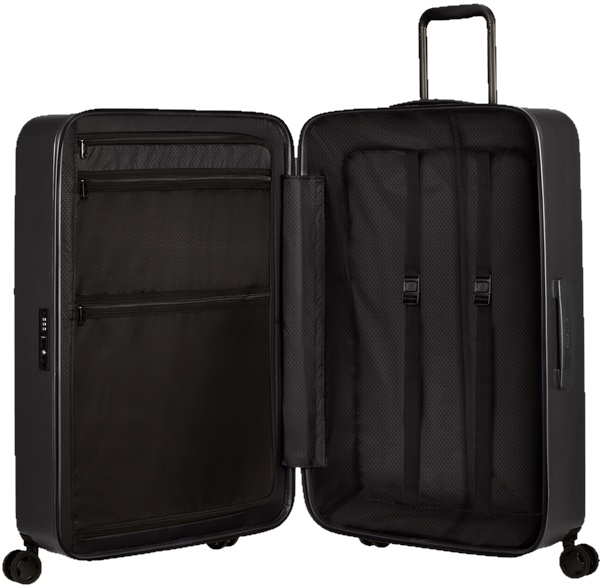 Samsonite StackD Spinner este un bagaj de călătorie urban modern, fabricat din policarbonat, un polimer ușor, rezistent și incredibil de durabil, cu un finisaj mat. Toată țesătura utilizată la producerea modelului este obținută din reciclarea recipientelor din plastic — una dintre amenințările moderne pentru mediu.