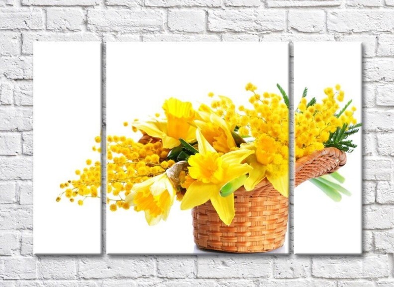 Pictură Rainbow Daffodils and mimosa twigs in a basket (500453)