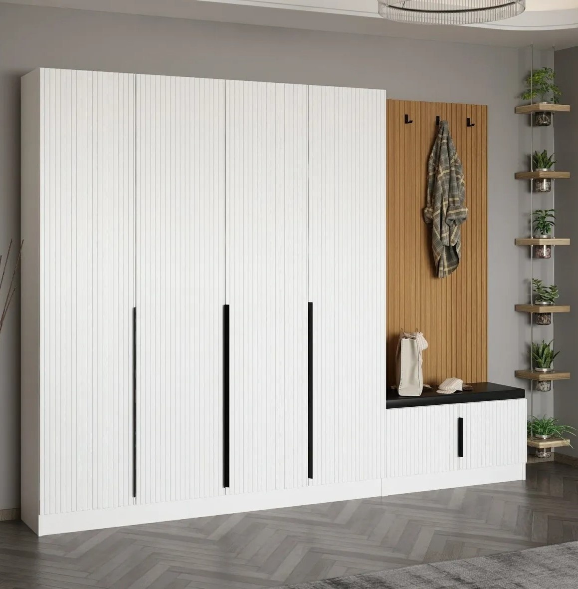 Cu o lățime de 270 cm, o înălțime de 210 cm și o adâncime de 35 cm, suportul pentru hol oferă un spațiu de depozitare generos pentru a menține holul organizat și ordonat. Rafturile și compartimentele spațioase oferă loc pentru chei, corespondență, pălării și alte lucruri esențiale, astfel încât totul să fie la îndemână.