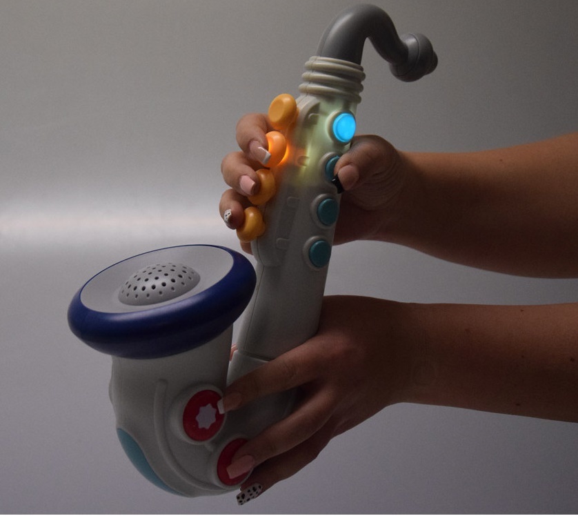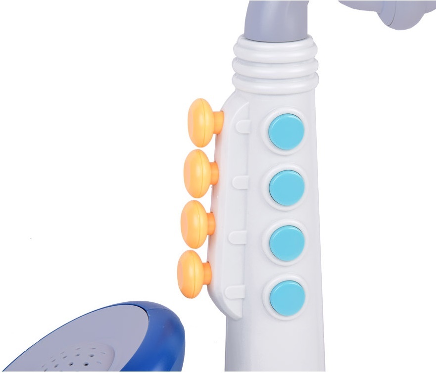 Copilul tău este interesat de muzică? Atunci cu siguranță îi va plăcea saxofonul care emite sunete şi lumini. Acest model are 8 piese dem, 8 ritmuri şi desigur 3 note muzicale care pot fi redate apăsând 3 taste colorate și suflând în trompetă. Un instrument muzical va ajuta la dezvoltarea auzului muzical a copilului și, de asemenea, la dezvoltarea imaginației sale. Bateriile nu sunt incluse.