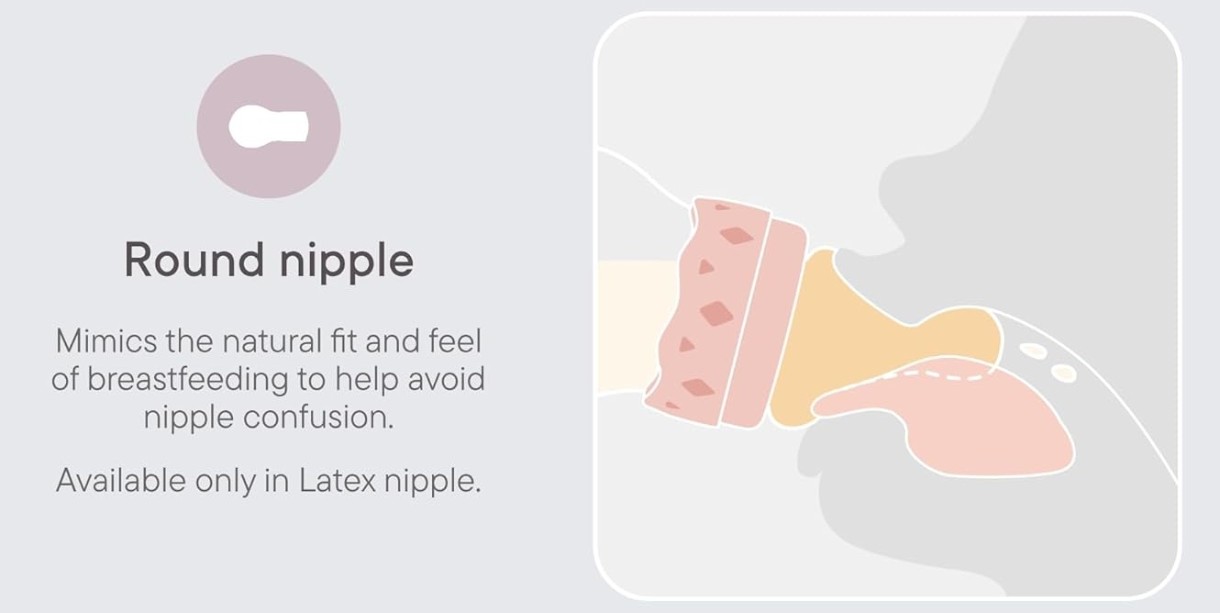 Tetina este rotunda, confectionata din latex de cauciuc natural si o are o curgere lenta, lucru care ajuta la calmarea bebelusului atunci cand acesta are colici