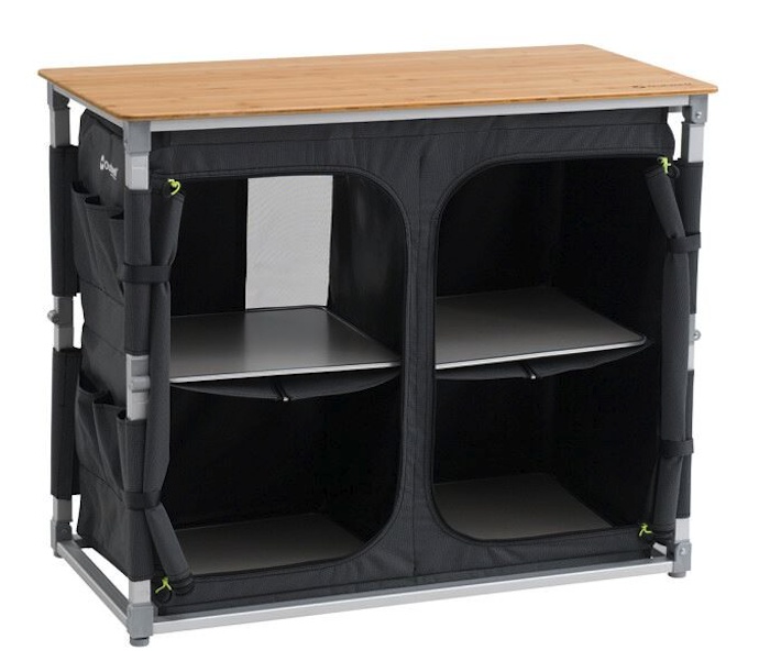 Organizator de camping robust cu blat din bambus – o soluție funcțională și practică pentru camping, care combină durabilitatea, confortul și un design bine gândit.