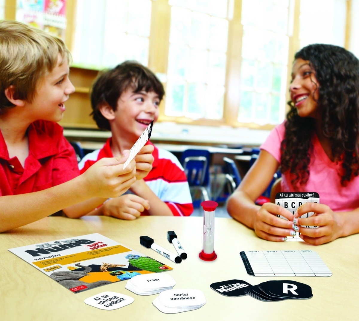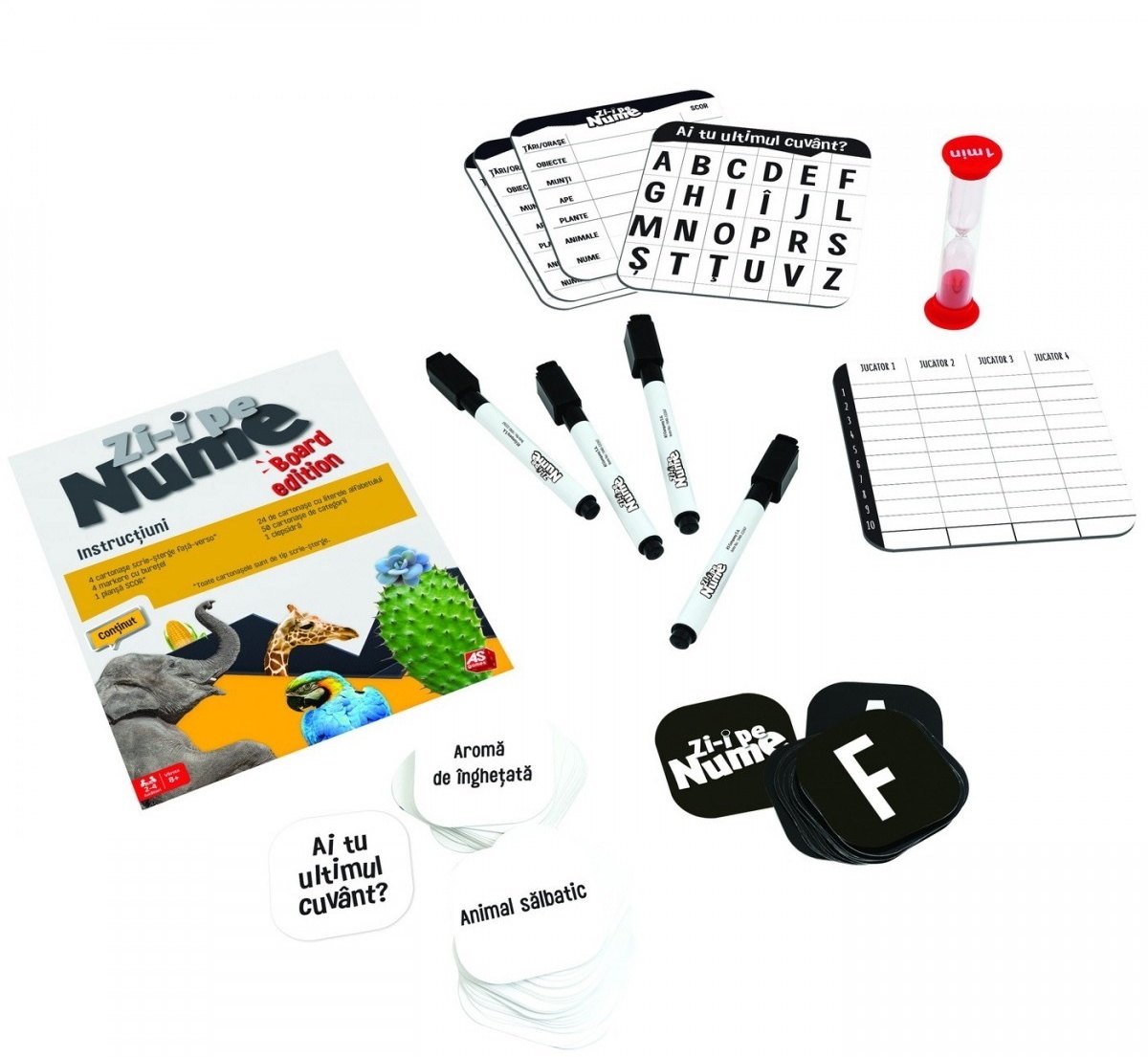 In set4 cartonase scrie-sterge, 4 markere, 1 plansa scor, 24 de cartonase cu litere, 50 de cartonase cu categorii, 1 clepsidra, 1 manual de instructiuni