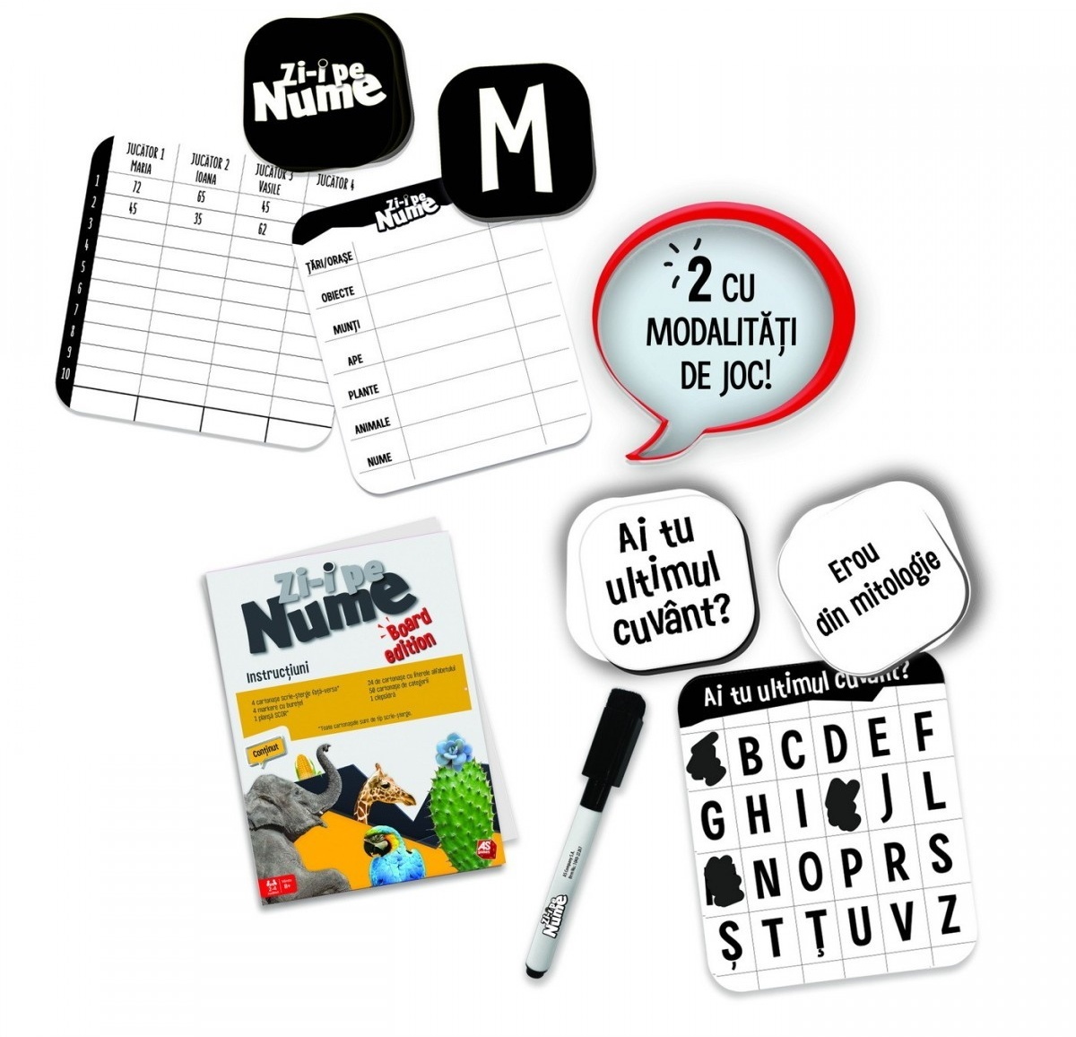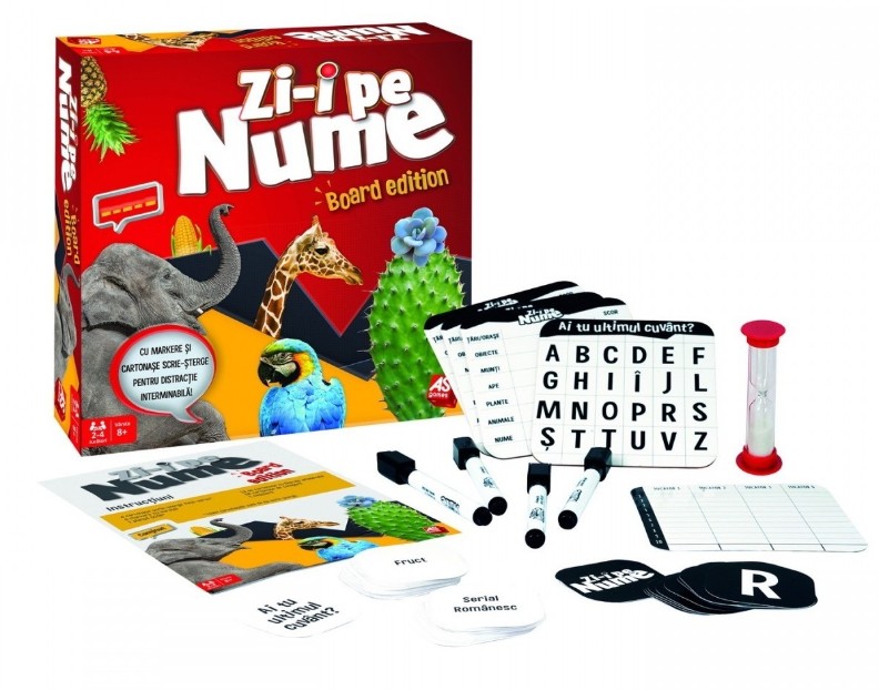 Zi-i pe nume! Jocul clasic tara-oras-munti-ape-plante-nume revine acum intr-o noua forma 2 in 1 TOMAPAN si Ai tu ultimul cuvant? Acum intr-o versiune 2 in 1 pentru 2-6 jucatori. Fiecare pe rand, trage un cartonas cu litera, si toti jucatorii trebuie sa gaseasca cuvinte din fiecare categorie cu litera aleasa. Cel mai rapid castiga
