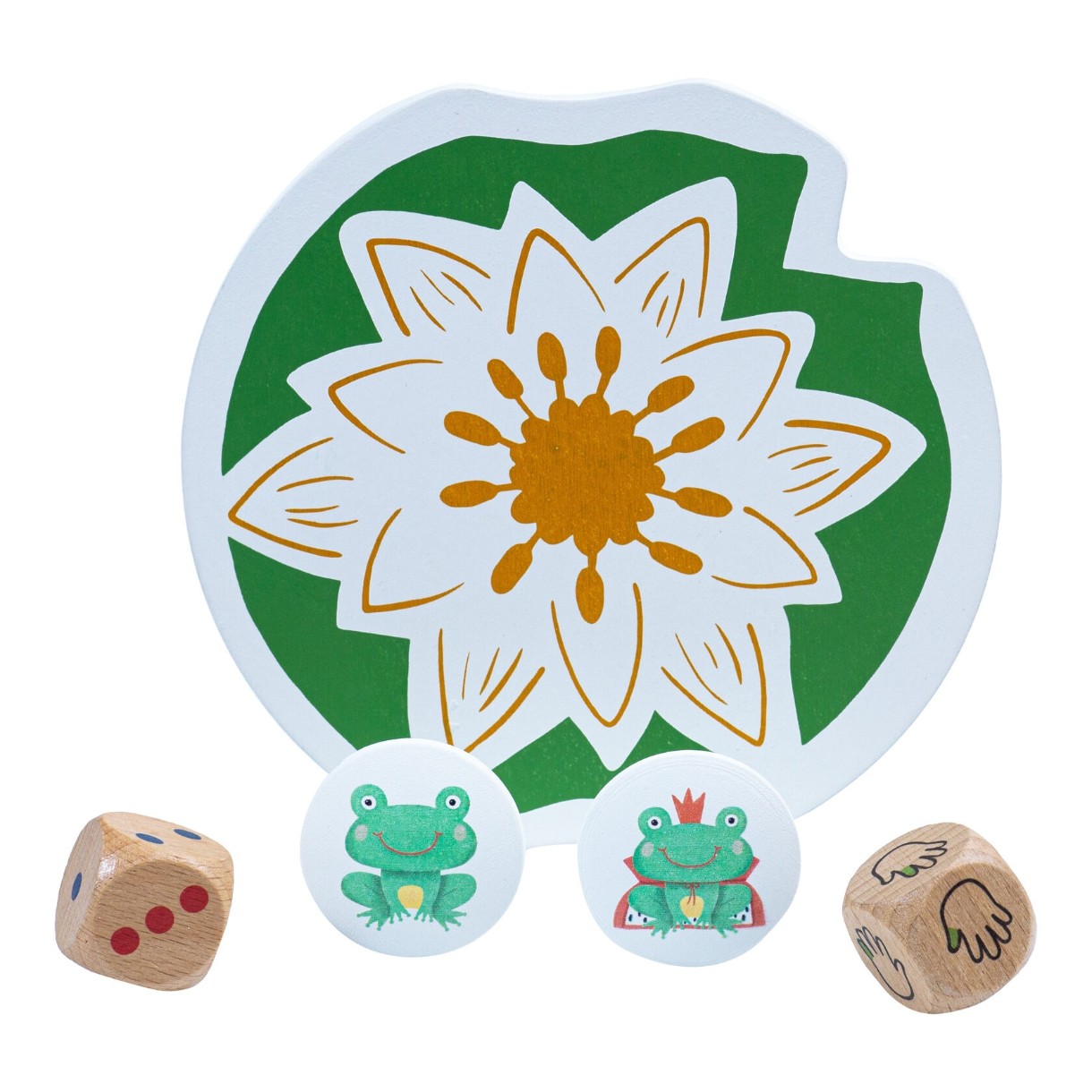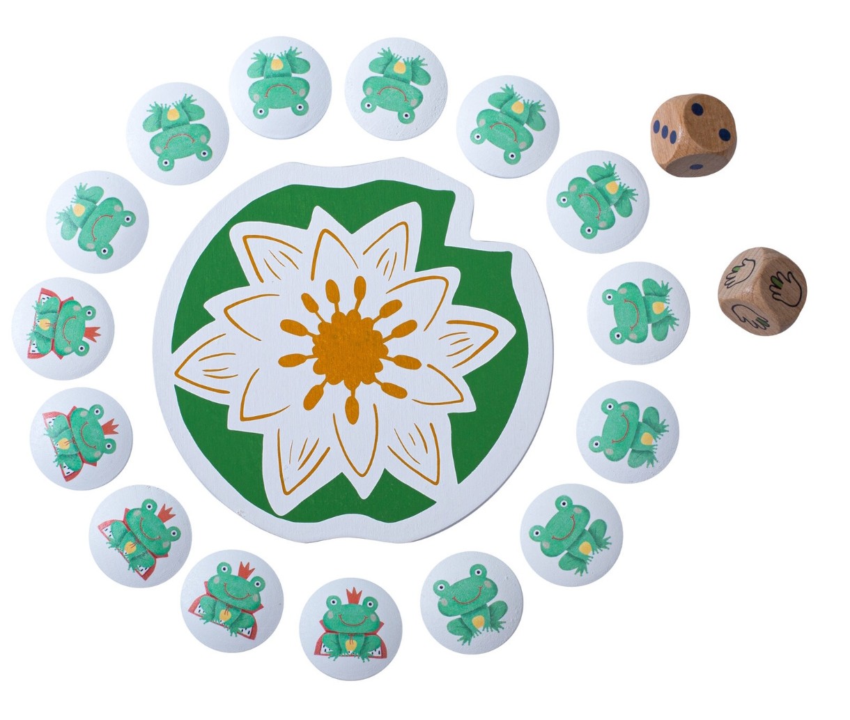In setTablă în formă de nufăr, 15 broaște din lemn, 2 zaruri din lemn, reguli de joc