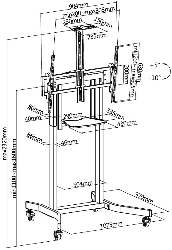 Standard VESA200x200, 300x200, 400x200, 300x300, 400x300, 600x200, 350x350, 400x400, 600x400, 800x400, 800x600 mm