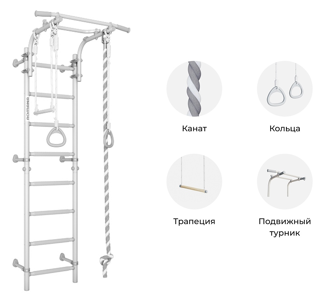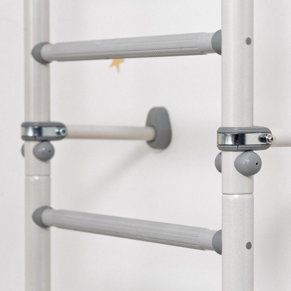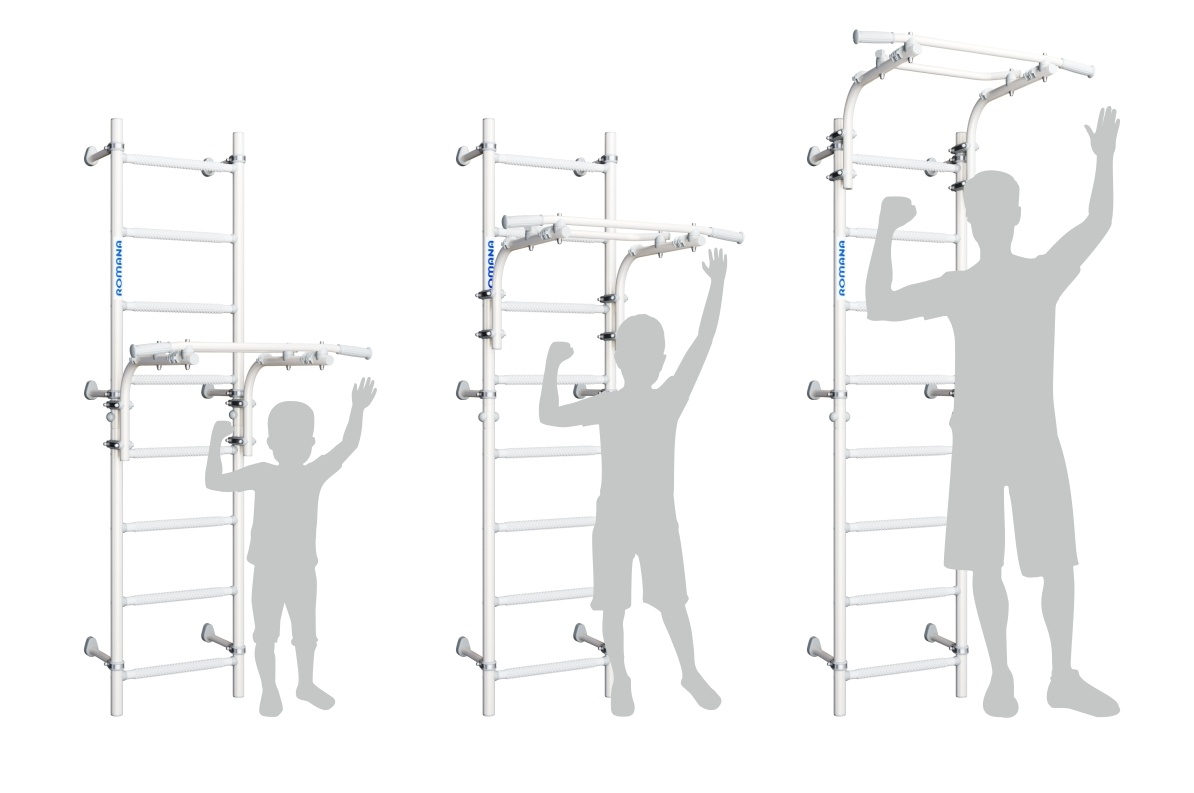 Complexul sportiv pentru copii ROMANA Next Pastel este o reproiectare elegantă a celui mai popular model din linia de bare de perete. Culorile pastelate calme, alb și gri, se potrivesc bine într-un interior modern.