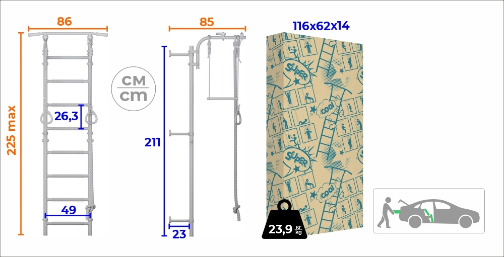 Acest DSC are o bară orizontală reglabilă care poate fi mutată la orice înălțime, permițând copiilor de diferite vârste să facă exerciții confortabil. Este fixat cu cleme de tip nou fiabile și convenabile, care sunt asamblate rapid și ușor. Datorită clemelor mobile de pe suporturile de perete, complexul poate fi fixat în poziția dorită, inclusiv în colț. Acest lucru evită să rămâneți prins în cavități sau cavitățile peretelui.