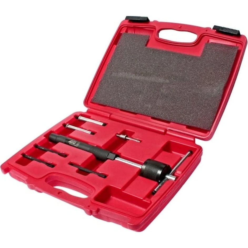 Setul de unelte pentru demontarea bujiilor de incandescență (7 piese în cutie) JTC 4052 include 5 extractoare cu dimensiunea exterioară a adaptorului de 2.7 mm, 3.6 mm, 5 mm (2 bucăți), 6 mm și 1 extractor cu diametrul interior al suportului adaptorului de 5.5 mm.