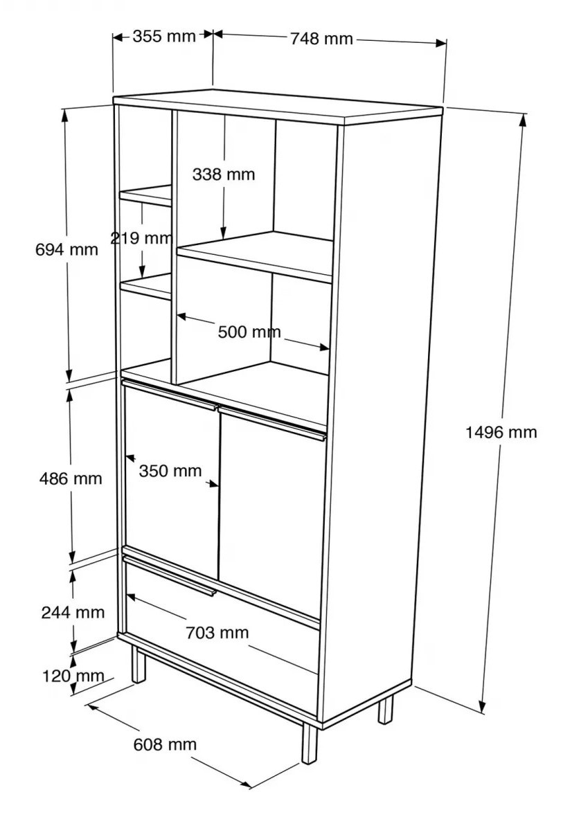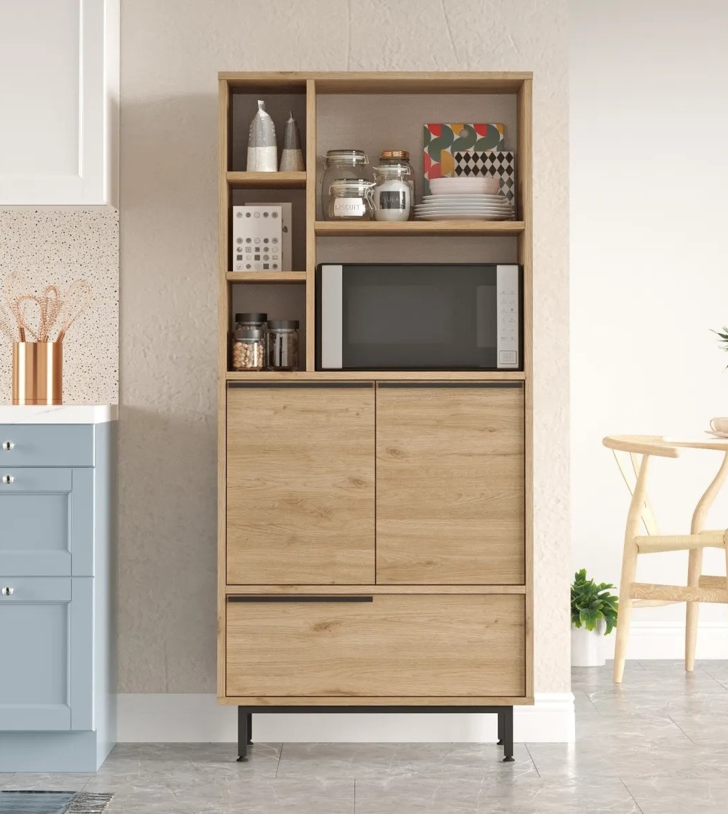 Cu o lățime de 74,8 cm, înălțime de 161,8 cm și adâncime de 35,5 cm, dulapul oferă un spațiu generos pentru depozitarea vaselor, tigăilor, ustensilelor și altor obiecte esențiale. Compartimentarea eficientă ajută la menținerea ordinii. Picioarele metalice oferă stabilitate și asigură fixarea fermă a dulapului.