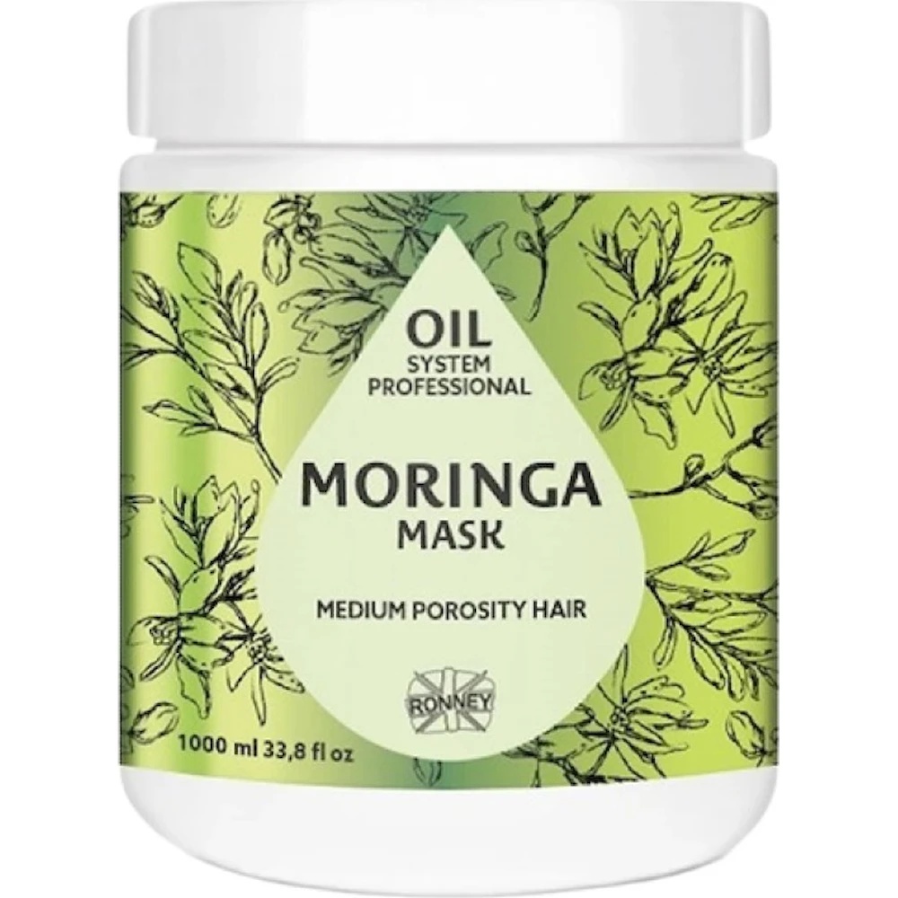 Masca pentru păr Ronney Moringa Medium Porosity Hair 1000 ml — tratament intensiv pentru părul cu porozitate medie, pentru menținerea sănătății, hidratarea și strălucirea acestuia.