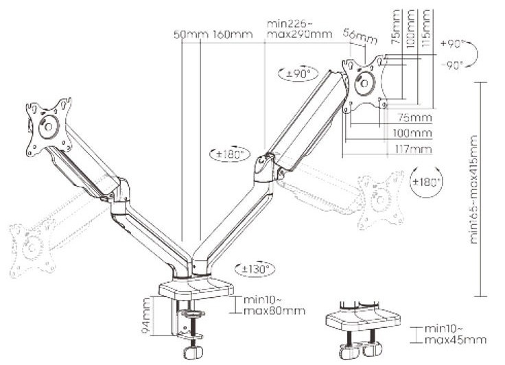 Standard VESA75x75, 100x100 mm