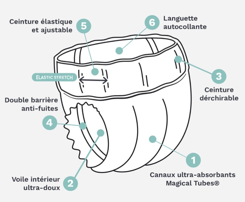 Sistemul de canale ultra‑absorbante și tehnologia Flash Dry asigură absorbție rapidă și uniformă a lichidului și mențin pielea uscată până la 12 ore, în timp ce bariera dublă împotriva scurgerilor și indicatorul de umezeală facilitează schimbarea. Scutecele au o suprafață exterioară moale „touché coton”, formă anatomică și manșete elastice, oferind o potrivire confortabilă și libertate de mișcare pentru copil.