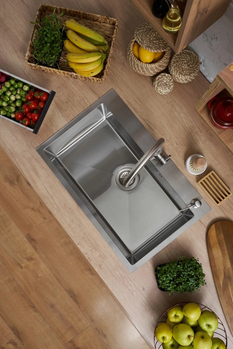 Chiuvetă de bucătărie cu baterie, dozator și picurător Fabiano 70x45 Satin