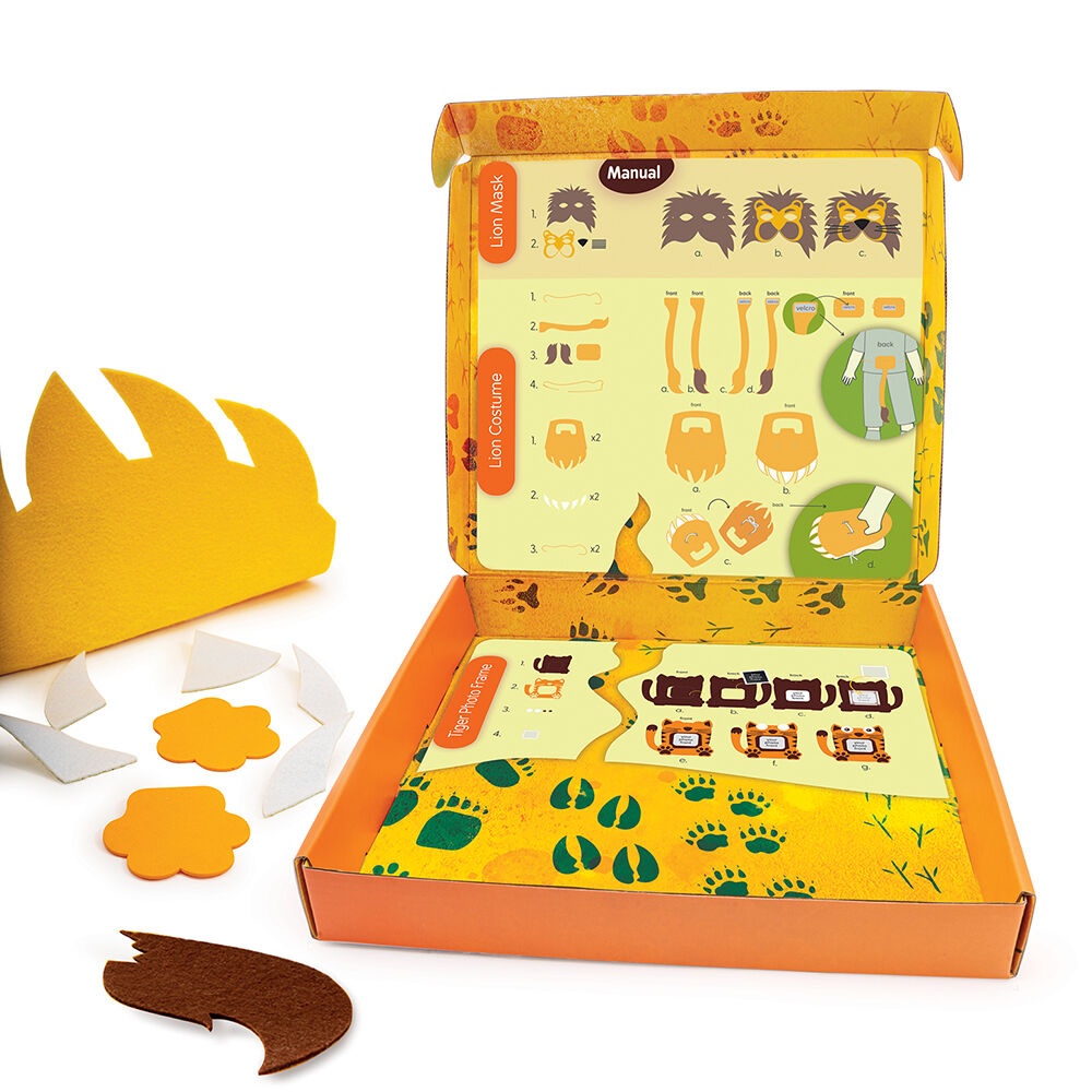 Fă-ți propriile meșteșuguri și descoperă jungla cu animale sălbatice. Costum cu coadă și labe de leu, mască de leu și ramă foto cu tigru special realizate din materiale sigure și moi pentru jocul creativ al copiilor.