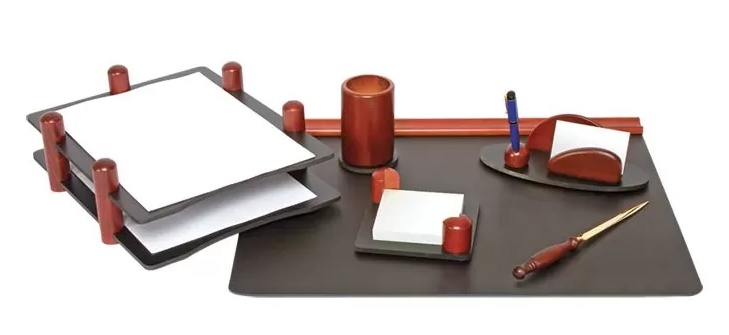 Alteleun set de 2 tăvi pentru documente, un cub de hârtie cu suport, un deschizător de plicuri, un suport pentru cărți de vizită și un stilou, un suport pentru scrierea materialelor, un folder desktop