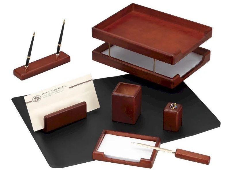 Alteleo tavă de hârtie formată din două secțiuni, un suport pentru două pixuri, un suport pentru un bloc de hârtie, un cuțit de hârtie, un suport pentru cărți de vizită, un suport pentru creion, o agrafă, un covor de masă