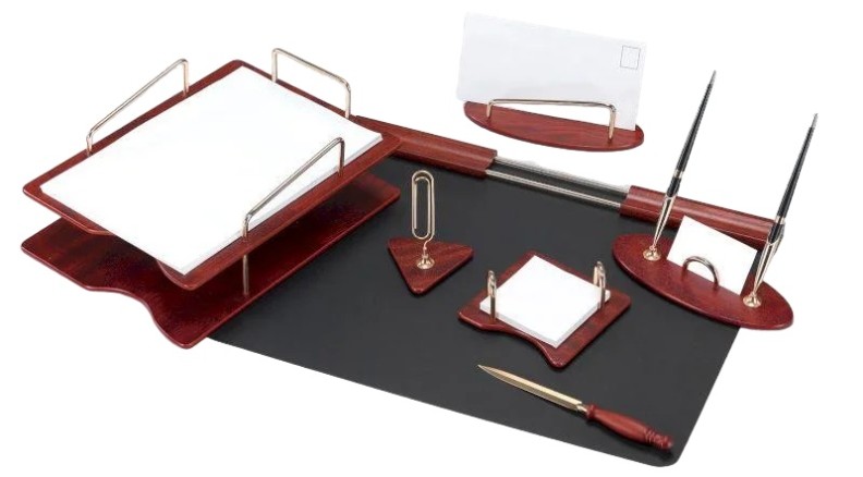 Alteleo tavă de hârtie pe două niveluri, un cuțit de hârtie, un suport pentru două pixuri, un suport pentru scrisori și plicuri, un covor de masă, un suport pentru cărți de vizită sub formă de agrafă, un suport pentru un bloc de hârtie
