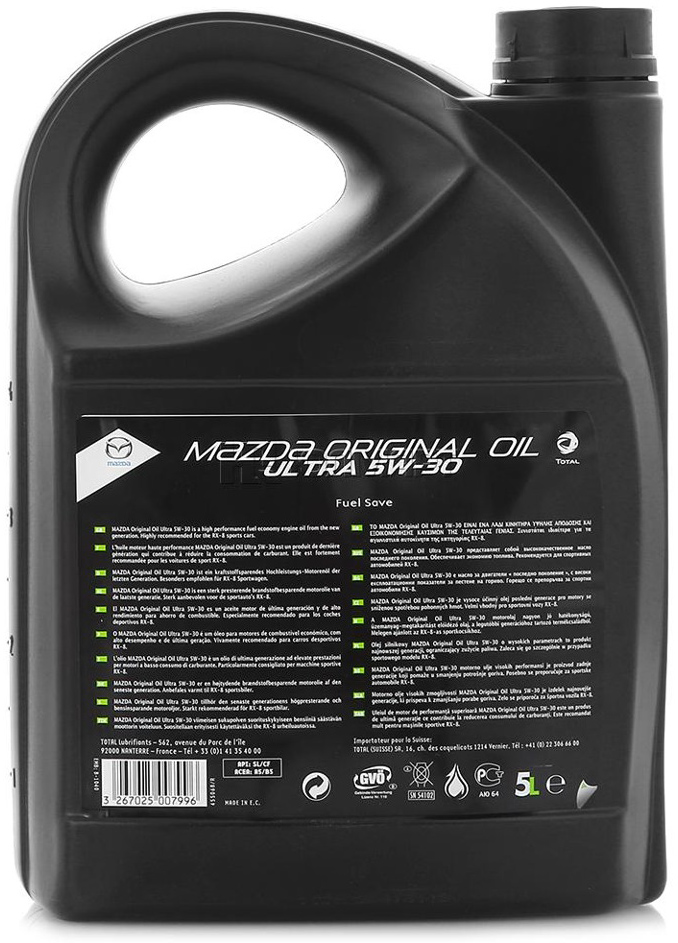 MAZDA Original Oil Ultra 5W30 — синтетическое моторное масло, производимое по самым последним технологиям. Рекомендуется для всех бензиновых двигателей (многоклапанных и с турбонаддувом, с катализатором или без) и для всех дизельных двигателей с турбонаддувом или с естественным забором воздуха легковых автомобилей и легких микроавтобусов. Особенно рекомендуется для повышенных требований дизельных двигателей с прямым впрыском.