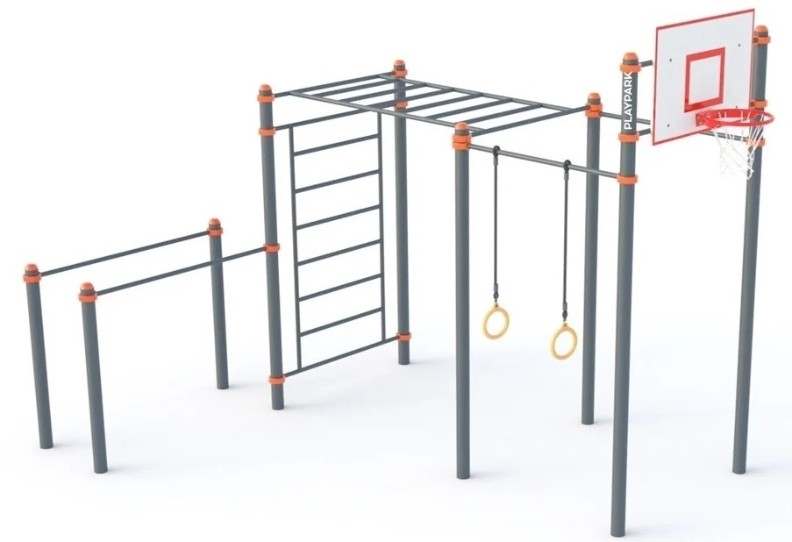 Echipamentedouă bare orizontale de diferite niveluri, bare, scara suedeză, batoane pentru maimuțe, inele, panou de baschet cu cerc