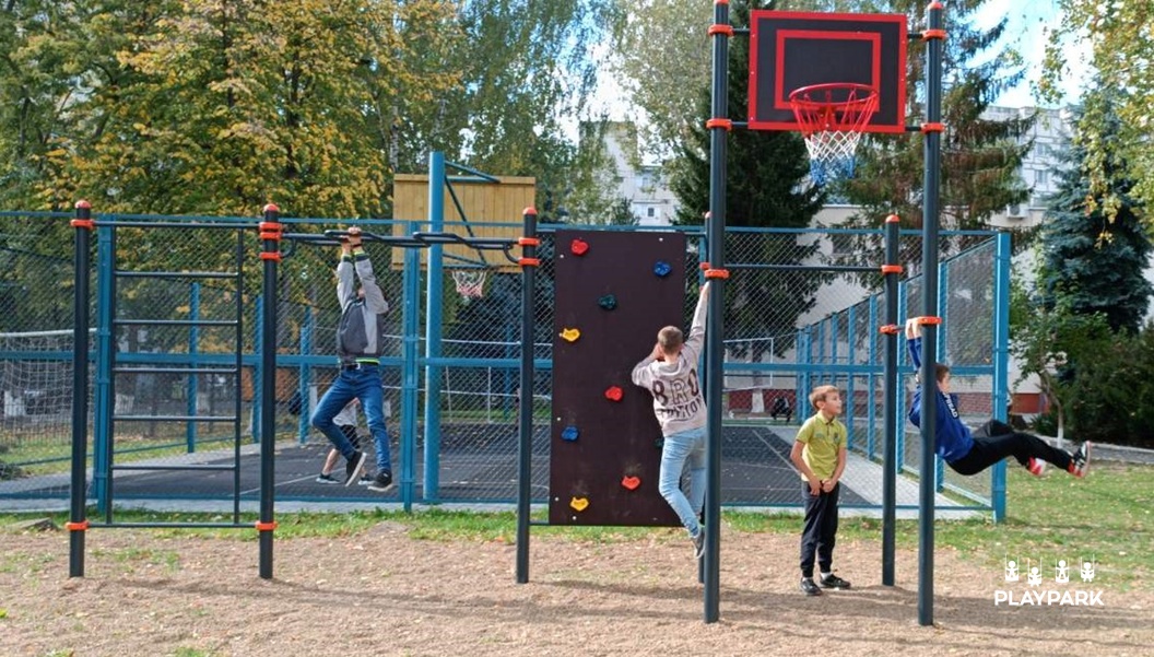 Echipamentetrei bare orizontale de diferite niveluri, batoane serpentine de maimuță, panou baschet cu inel, scara suedeză, perete de escalada