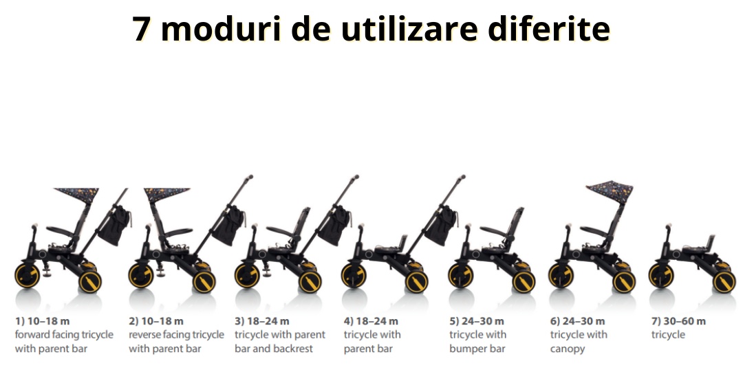 O tricicleta unica si ideala pentru orice tip de calatori, Nova 2 de la Zopa poate fi folosita pana la 7 moduri incepand de la 10 luni pana la 5 anisori. Se adapteaza tuturor nevoilor micutilor pe masura ce acestia cresc si se dezvolta. Poate fi luata oriunde gratie functiei de pliere care o face foarte compacta si incapatoare.Tricicleta are un design modern si in pas cu tendintele actuale. Copertina este tratata UPF+50 si protejeaza micutul de razele solare puternice si nocive pe timp de vara. Manerul si pedalele sunt detasabile, si este inclusa si o geanta pentru a tine lucrusoarele esentiale pe parcursul calatoriei. Rotile sunt calitative umplute cu spuma iar siguranta micutilor este asigurata de centura de prindere in 5 puncte, o bara pentru maini transversabila si frana care blocheaza rotile. Plimbarile confortabile sunt asigurate de pernita sezutului si a spatarului care poate fi detasata pentru o curatare mai usoara.