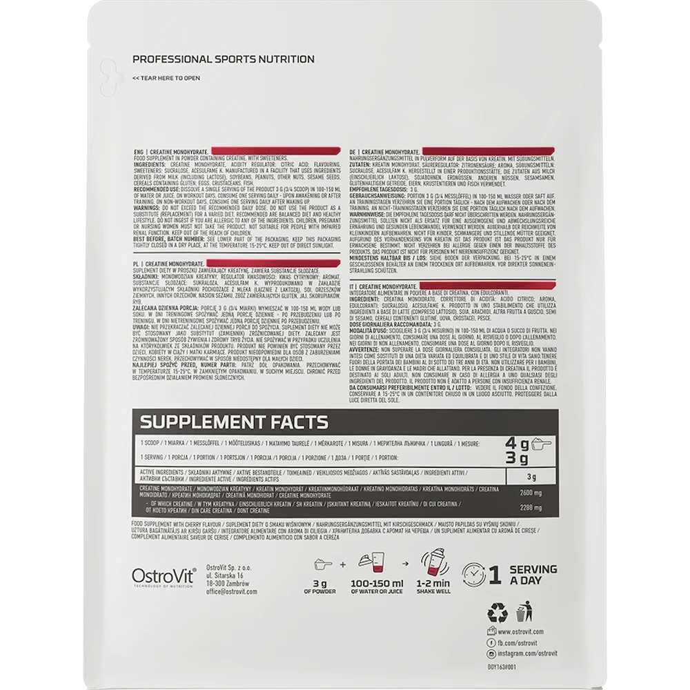 Produsul OstroVit conține monohidrat de creatină, adică o moleculă de creatină legată de o moleculă de apă – deoarece creatina este un compus hidrofil, se combină ușor cu apa, având o biodisponibilitate excelentă. Monohidratul de creatină este forma structurală cea mai simplă și, totodată, cea mai populară în rândul sportivilor. Este ideal atât pentru începători, cât și pentru sportivii profesioniști, deoarece creatina contribuie la creșterea performanței fizice în timpul exercițiilor scurte, intense și repetate – efectul benefic se obține printr-un consum zilnic de 3 g de creatină.