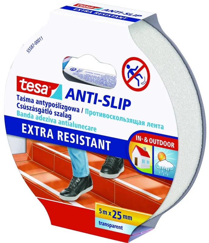 Banda antiderapantă TESA transparentă, 5 m x 25 mm este utilă oriunde este nevoie de un sprijin sigur pentru picioare. Este protecția ideală pentru prevenirea accidentelor pe trepte, scări, suprafețe înclinate, borduri de bărci și alte suprafețe alunecoase. Banda antiderapantă TESA poate fi utilizată atât în interior, cât și în exterior.