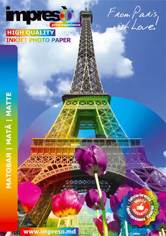 Hirtia Foto Mata IMPRESO este cea mai populara, datorita celui mai bun raport dintre pret/calitate. Imaginile imprimate pe Hirtie Foto Mata IMPRESO nu au stralucire orbitoare, liniile au un contrast inalt, nuantele au au o adincime tipic catifelata. Hirtia Foto Mata IMPRESO este cea mai potrivita pentru imprimarea unor astfel de imagini, care trebuie sa excluda obosirea ochilor (spre exemplu texte ilustrate).