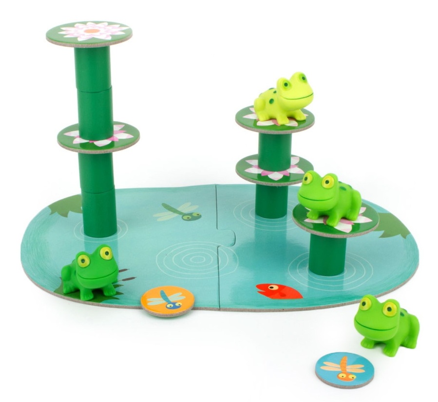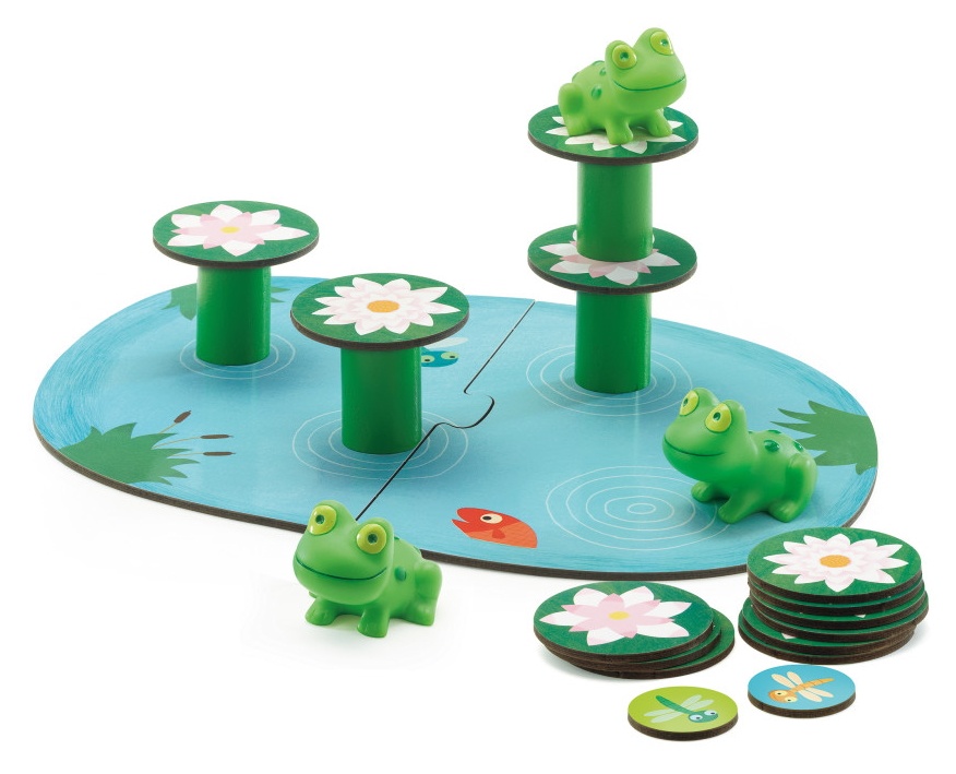 In set4 broaște, 1 teren de joc (bază), format din două piese de puzzle, 12 grămezi, 12 nuferi, 15 jetoane (puncte premiu), 1 insert cu reguli de joc