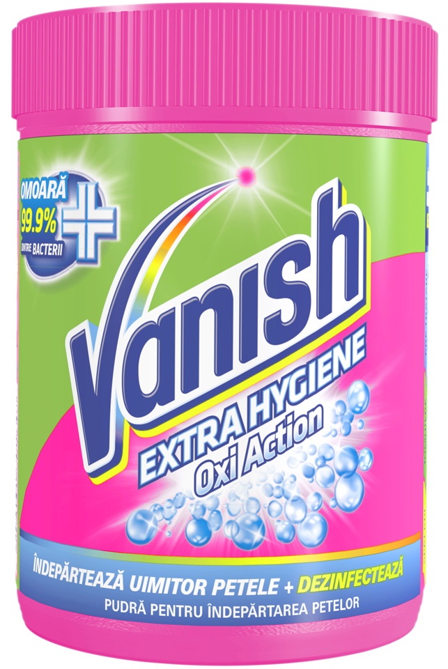 Vanish Extra Hygiene Pudra combina: Sistemul de detectare a petelor, care functioneaza pe toate tipurile de pete, chiar si pe cele dificile de grasime. Agenti speciali de igienizare, ce omoara 99,9 % dintre bacterii. Actiune antibacteriana si antifungica. Nu afecteaza tesaturile colorate sau pe cele albe. Actiune antibacteriana si antifungica. Adaugati in masina de spalat Vanish Extra Hygiene Pudra la fiecare spalare. Nu afecteaza tesaturile colorate sau pe cele albe.