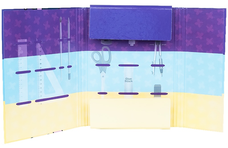 Pentru a se asigura că rechizitele sunt bine fixate și nu cad, este prevăzută o bandă elastică de fixare. Datorită vârfurilor cu imagini ale articolelor, copilul nu va uita nimic în timp ce se pregătește pentru lecție.