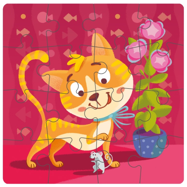 Astăzi pisicuța se distrează și se joacă astăzi cu un șoricel. Principalul lucru este să nu strice vaza preferată a stăpânei! Adună acasă o întreagă grădină zoologică – cățel, pisoi, elefant, ponei și multe alte animale într-o serie de puzzle-uri din 16 piese. Puzzlle captează atenția copilului, iar datorită pieselor mari și cartonului dens, va rezista la orice joc. Potrivit pentru copiii de la 3 ani, ajută la dezvoltarea abilităților motorii fine, a coordonării și a gândirii spațiale.