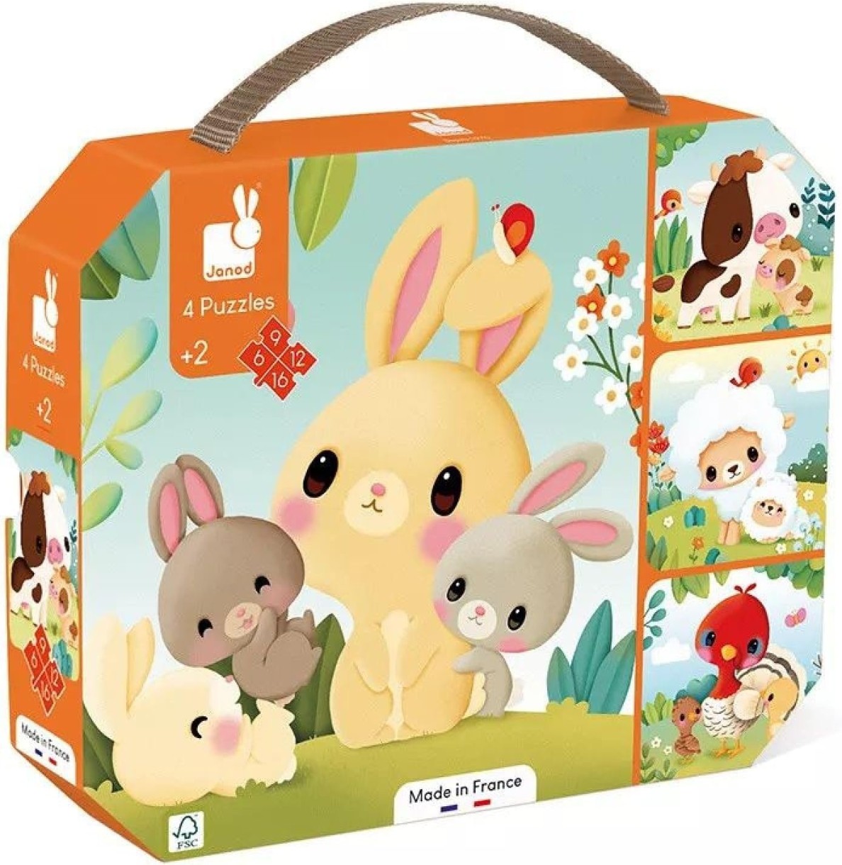 Treceți pe la noi și vedeți animalele de la fermă! Cu acest set de 4 puzzle-uri evolutive, copiii cu vârsta de 2 ani și peste își vor extinde vocabularul și își vor dezvolta logica și abilitățile motorii, înconjurați de ilustrații încântătoare. Aceste 4 puzzle-uri din carton se diferențiază prin numărul de piese: sunt scalabile, variind de la 6 la 16 piese! În acest fel, bebelușul poate progresa în ritmul său, familiarizându-se în același timp cu animalele de la fermă. Alegerea ideală pentru a vă ajuta copilul să își dezvolte abilitățile motorii fine pas cu pas, trecând de la 6 și 9 piese la 12 până la 16 piese: vor fi încântați să-și vadă progresul! De asemenea, cei mici își pot completa singuri puzzle-urile de la fermă, datorită culorii de fundal specifice fiecărui puzzle. Cine îi poate entuziasma mai bine pe cei mici decât micuțele animale de la fermă? Lăsați-vă mângâiați de ilustrațiile drăguțe care îi vor ajuta pe copii să învețe numele animalelor și ale puilor lor: un iepure și iepurașii săi, o oaie și mielul său, o vacă și vițelul său și un curcan și puii săi. Ingenios: cele 4 puzzle-uri ale dvs. vor încăpea în valiză, la fel ca micii noștri companioni. Puzzle-urile sunt ideale pentru a insufla copiilor logică, concentrare și calm. Combinate cu ilustrații frumoase, rezultatele finale sunt un prim puzzle ultra-avantajos care promovează dezvoltarea copiilor. Acest set de puzzle-uri este fabricat în Franța din carton certificat FSC™. Este decorat cu cerneluri pe bază de plante.