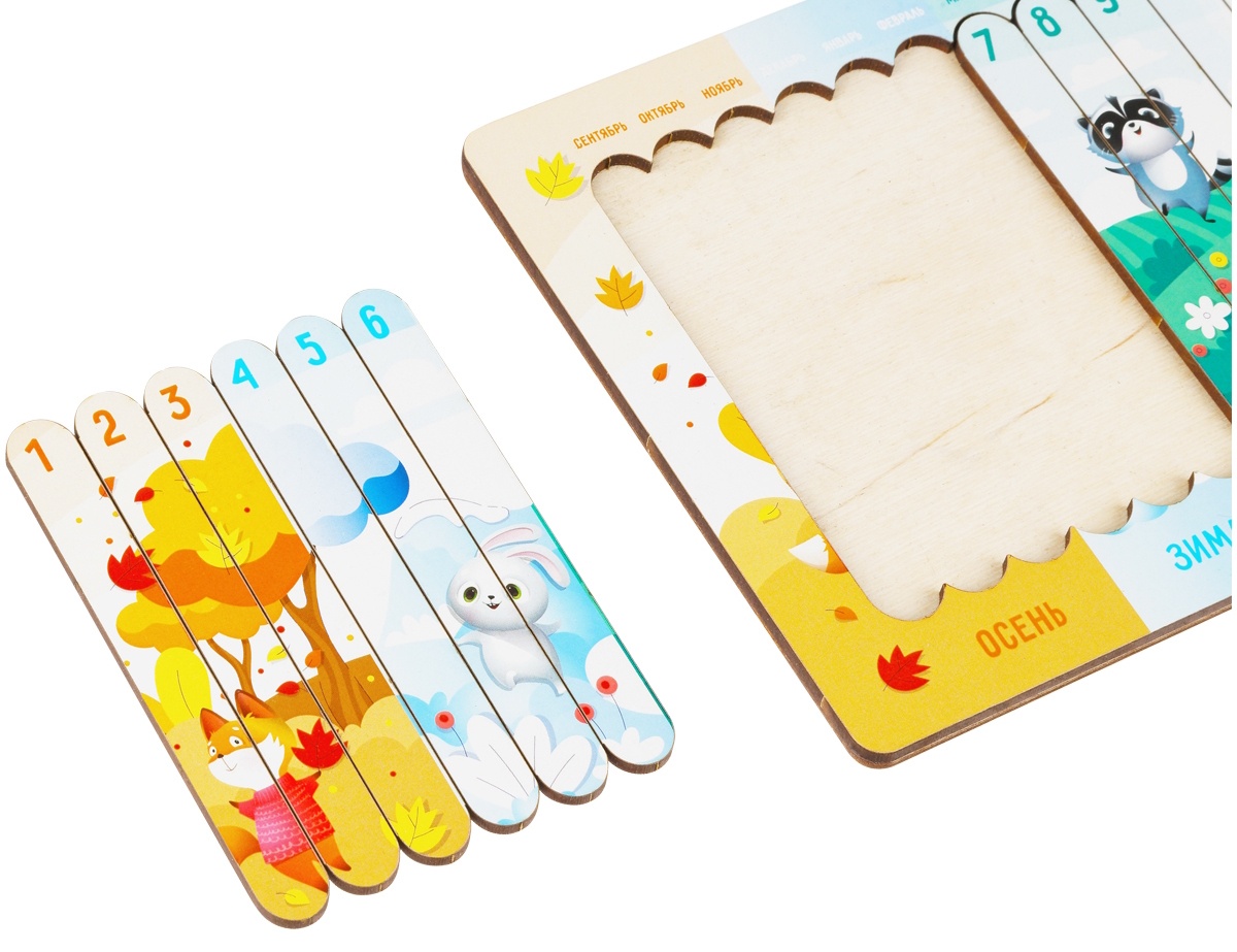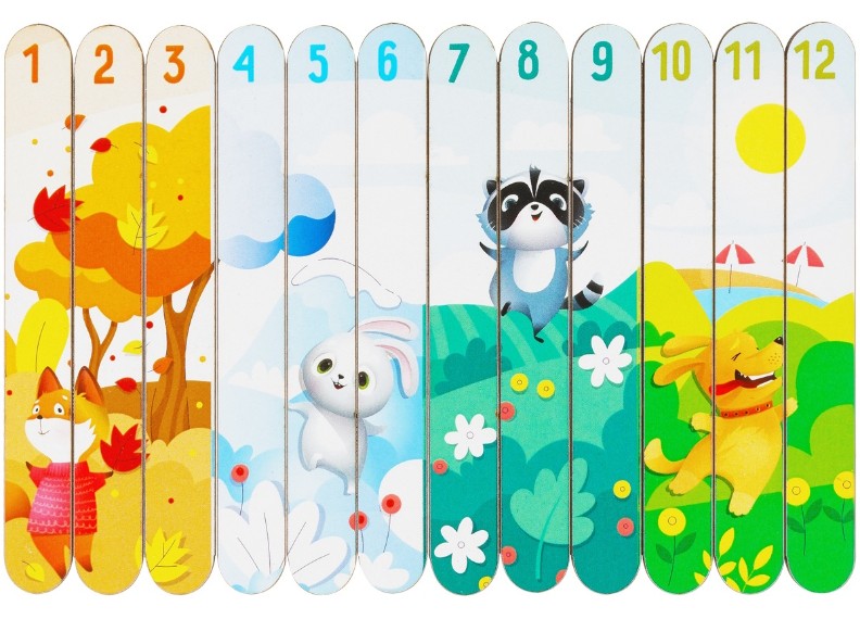 Puzzle-ul cu bețe este un joc educativ distractiv pentru copiii mici. Setul include 12 bețe de lemn care se îmbină pentru a forma o ilustrație. Puzzle-ul este folosit pentru a învăța despre luni și anotimpuri, animale și culori. Jocul cu bețele dezvoltă logica, atenția, perseverența, memoria și abilitățile motorii fine. Piesele sunt mari, ceea ce le face confortabile pentru cei mici. Sunt fabricate din materiale ecologice - placaj și HDF. Designul colorat este imprimat cu cerneluri sigure. Toate piesele sunt șlefuite cu grijă și au colțuri rotunjite. Folosind bețele, puteți exersa diverse jocuri educaționale. De exemplu, arătați-i copilului dumneavoastră un puzzle asamblat corect, apoi turnați piesele pe masă, amestecați-le și rugați-l să le mute în locurile lor corespunzătoare. Puteți îndepărta câteva bețe, lăsând spații goale pentru ca copilul dumneavoastră să identifice ce piesă lipsește. Dimensiunea tablei de puzzle este de 19 x 14 cm.