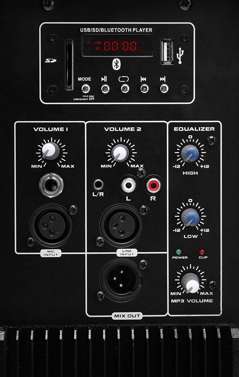 conectica: 6.3 mm jack in, XLR mic in, 3.5mm jack AUX in, RCA line input, XLR line in, XLR mix out